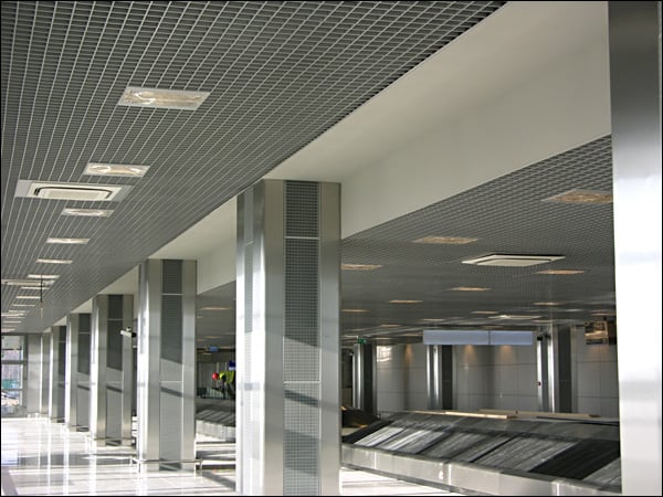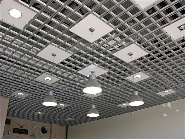 Modular openwork ceilings constructed from U-shaped profiles with side walls bent at a 45-degree angle at mid-height. By bending the walls, we achieved a unique visual effect and reduced the ceiling's open area. Panels in 600x600 and 600x1200 mm modules are installed on a system structure with the same cross-section as the ceiling slab. Open-cell ceilings are manufactured with mesh sizes ranging from 75 to 300 mm.
