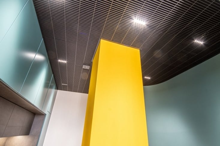 Base 5 open-cell ceilings are constructed from 25x5 mm U-shaped slats. The narrow slat allows for the construction of ceilings with very fine mesh (from 30 mm) while maintaining a large open-cell area (almost 70% for a 30x30 mm mesh). The open-cell panels can also be installed on standard T24 and T15 structures.